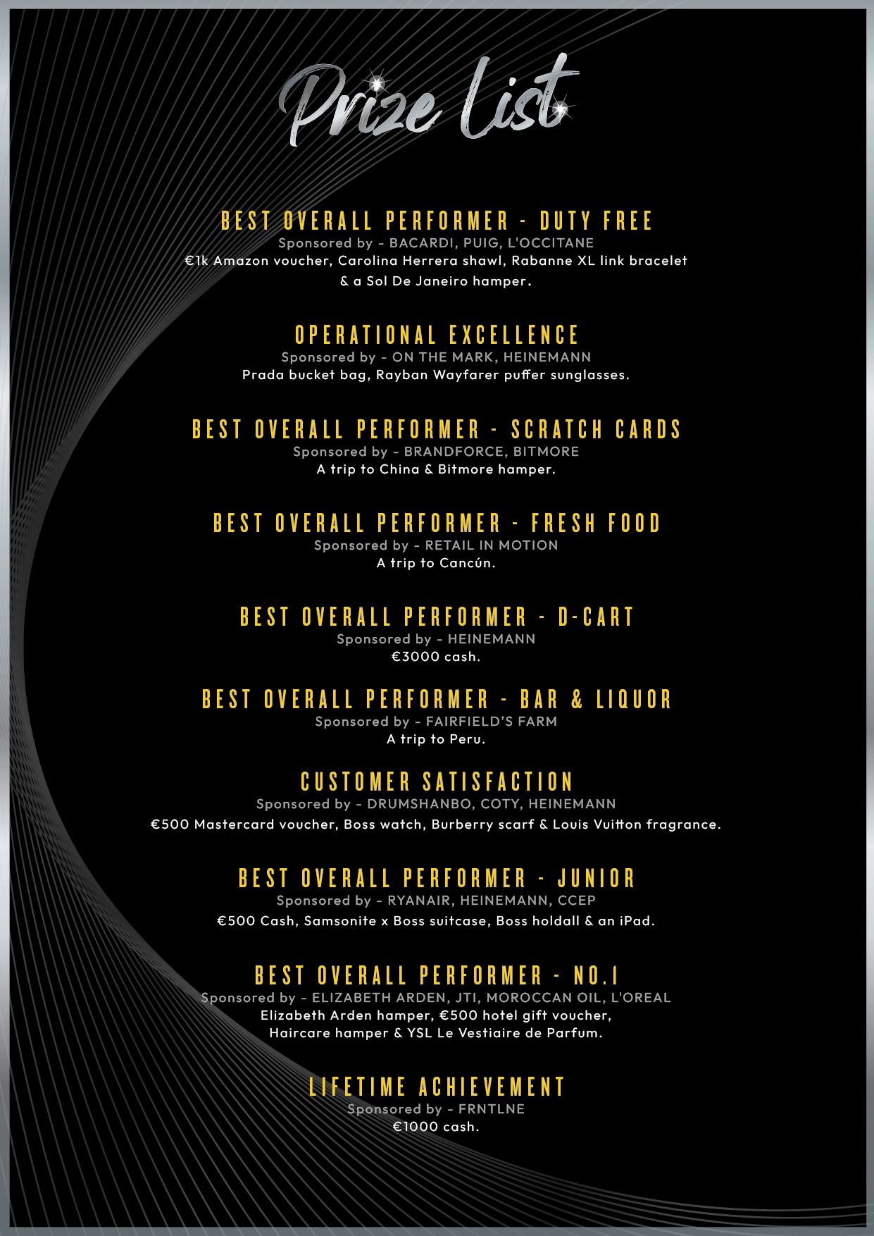 This year there will be 10 award categories, Best Overall Performer Duty Free, Operational Excellence, Best Overall Performer Scratch Cards, Best Overall Performer Fresh Food, Best Overall Performer D-Cart, Best Overall Performer Bar & Liquor, Customer Satisfaction, Best Overall Performer Junior, Best Overall Performer No.1 and Lifetime Achievement.